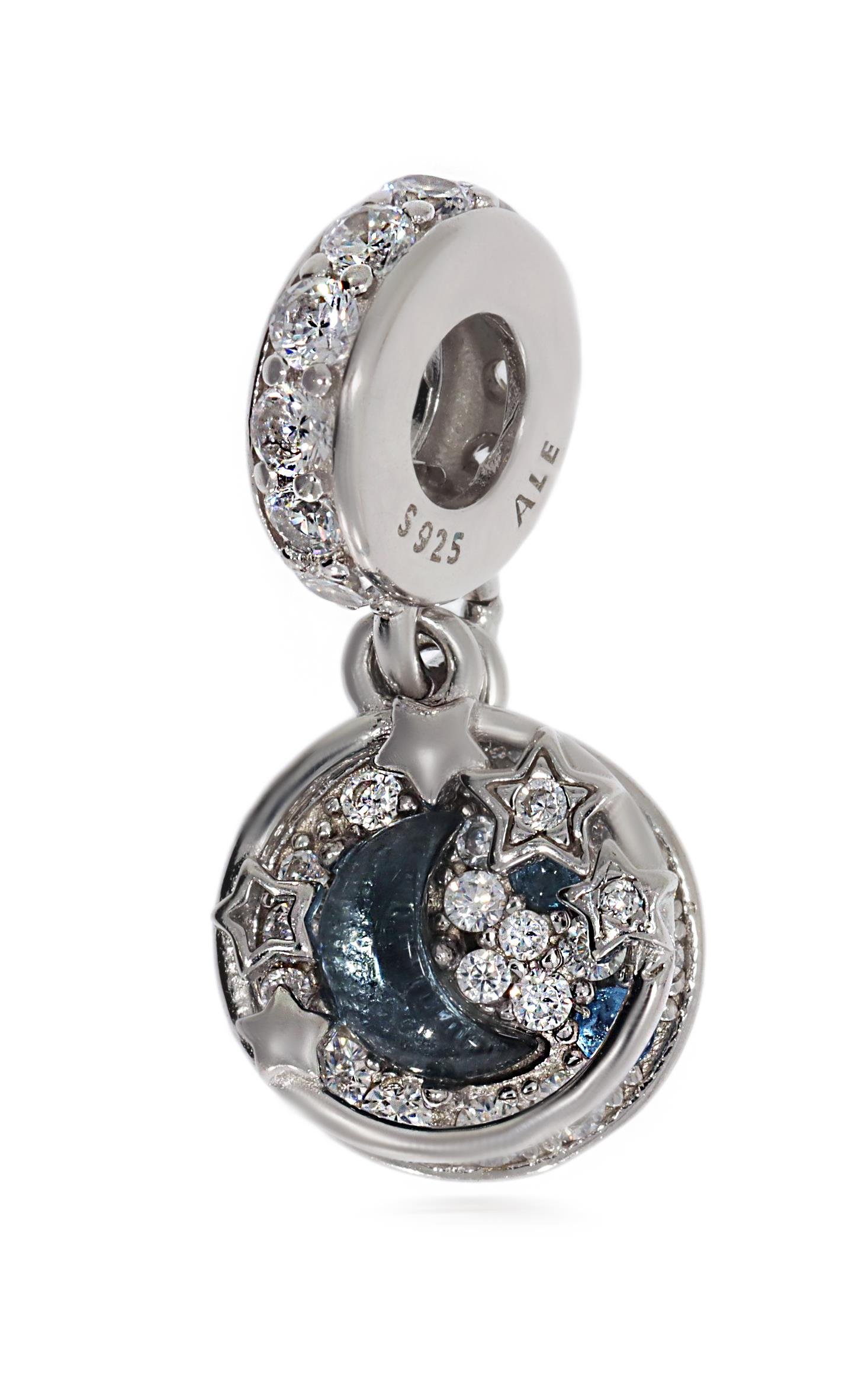 Mavi Gece Gökyüzü, Ay ve Yıldızlar Sallantılı Gümüş Charm (ST00786)